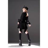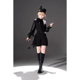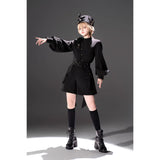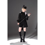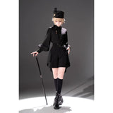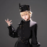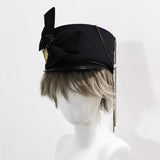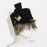 しっかりとしたフォルムで高さをもたせたクラシカルなシルエットに、わずかに光沢を帯びたブラックのブリムを組み合わせた、気品と反骨心をあわせ持つミリタリー調ハット。大きく結ばれたブラックリボンが凛とした存在感を放ち、中央にはアンティークゴールドのレリーフモチーフがあしらわれ、さらに繊細なチェーンが側面から垂れ下がることで静かな揺らぎと退廃的な華やかさを醸し出しています。