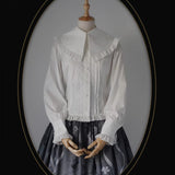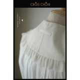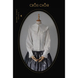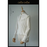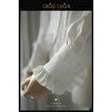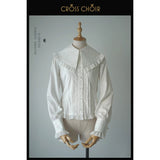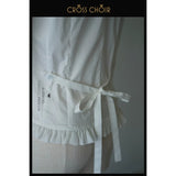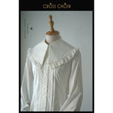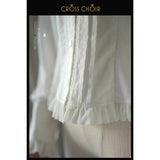 静寂に包まれた礼拝堂で、静かに祈りを捧げるお嬢様の姿をイメージして制作されたブラウス。大きく広がる襟は、まるで柔らかな光を受ける祭壇の布のように穏やかで、その縁を飾る細やかなフリルは、祈りの中で揺れる静かな呼吸のように繊細なリズムを刻みます。胸元に並ぶ整然としたボタンと縦のラインは、厳かな空間に流れる規律と秩序を象徴しています。袖口にあしらわれた十字のデザインは、控えめでありながら確かな意味を持ち、信仰や静かな決意をさりげなく表現しているかのようです。