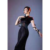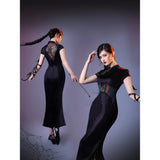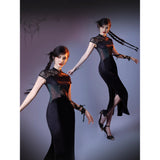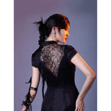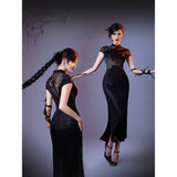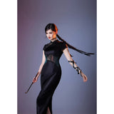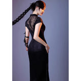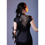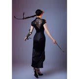 静まり返った夜の空間に張り巡らされた蜘蛛の巣の神秘的な美しさと、危うい魅力をまとった幻想的な存在感を表現したチャイナワンピース。深い黒の生地は、光の届かない夜の静寂を思わせ、その上に重ねられた繊細なレースや刺繍は、朝露をまとった蜘蛛の巣が闇の中でひそやかに輝く瞬間を表現しているかのようです。背中に広がる透け感のあるレース模様は、まるで空間に静かに張り巡らされた蜘蛛の巣そのもののように、細く繊細な糸が複雑な幾何学を描き出しています。ウエスト部分に配置された切り替えや装飾のラインは、蜘蛛が中心から放射状に糸を紡いでいく構造を思わせ、身体のラインに沿って緊張感のある美しい構図を生み出しています。