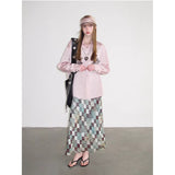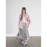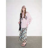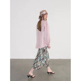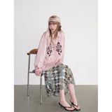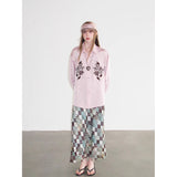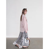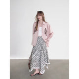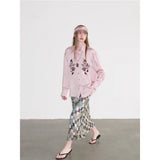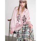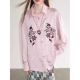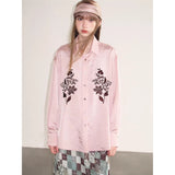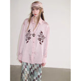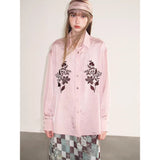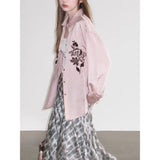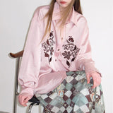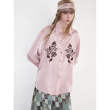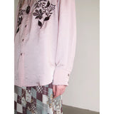 春の静かな庭に咲く花々を、古い刺繍図案のように胸元へ写し取ったシャツ。やわらかな光沢を帯びた淡いピンクの生地は、朝露を含んだ花びらのようにほのかに輝き、胸元に左右対称に施された深い色合いの花刺繍は、まるで庭の草花を丁寧にスケッチして布に縫い留めたかのような繊細さを感じさせます。落ち着いた色調の刺繍は、華やかというよりも静かな植物標本のような趣を持ち、穏やかな時間の流れを思わせます。