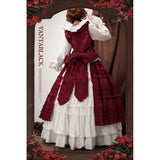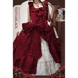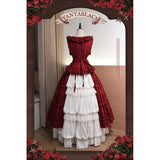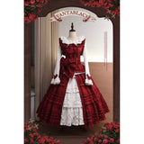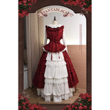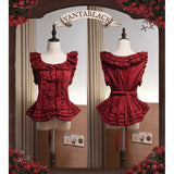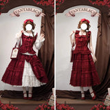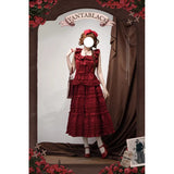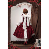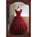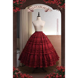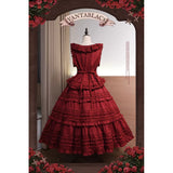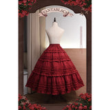 ヴィクトリア朝の社交界、赤い薔薇が咲き乱れるゴシックガーデン、そして静かな夜会の余韻――そんなクラシカルでロマンティックな雰囲気を醸し出しているトップスとスカート。トップスは、幾重にも重なるフリルが胸元と裾を縁取り、19世紀の貴婦人の装いを思わせる優雅な気配を纏っています。程よく絞られたウエストラインと、柔らかなラッフルの立体感が、気品と甘美さを同時に演出。ホワイトブラウスと合わせたスタイリングからは、古典文学のヒロインのような清楚さと情熱的なコントラストが感じられます。スカートは、段々に広がるティアードフリルが贅沢に重なり、まるで薔薇の花弁が幾重にも咲き誇るかのようなボリューム感。歩くたびに揺れるフリルは、舞踏会のドレスを思わせる華やかさと、物語の中の令嬢の気高さを表現しています。