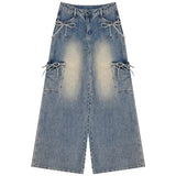ゆったりとカジュアルにお召しいただけるワイドデニムパンツ。キュートなリボンが印象的。柔らかなウォッシュ加工が施されたデニムの色合いは、長い時間をかけて履き込まれたヴィンテージデニムのような風合いを持ち、ゆったりと広がるワイドシルエットは、自由に街を歩き回るストリートスタイルの軽やかさを感じさせます。