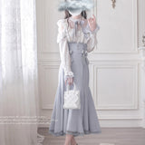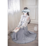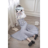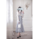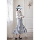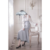 優雅さと可愛さを兼ね備えた令嬢のような、クラシカルな甘さを醸し出しているアイテム。フリルとレースを贅沢にあしらったトップスは、透け感のあるレースがエレガントな陰影を添え、肩を程よく見せるカッティングが華奢な印象を演出します。ロング丈のスカートは、流れるようなマーメイドシルエットに、しっかりとしたハードなコルセットを施したデザイン。裾部分にはレースが装飾されており、ロマンティックなムードを強調しています。