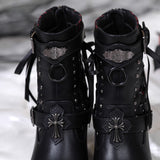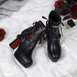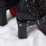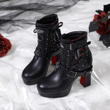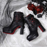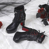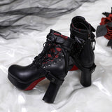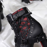 黒革の重厚感と赤いレースの妖艶さを融合させ、ゴシックの美学をそのまま立体化したようなハイヒールブーツ。サイドには赤いレース越しに編み上げのリボンが走り、金属スタッズが光を反射して、まるで禁断の装飾のように存在感を放ちます。足首にはバックルやリングが重なるように配置され、さらに正面には鈍い銀色のクロスモチーフが刻まれたストラップがあしらわれ、祈りと呪いの狭間を歩くような雰囲気を漂わせています。ヒールは太めで安定感がありながら、赤のアウトソールが覗き、黒と赤が織りなす退廃的なコントラストがひときわ映えます。