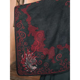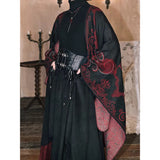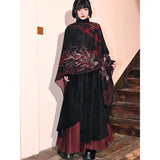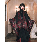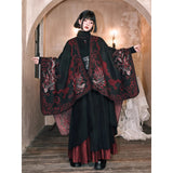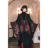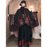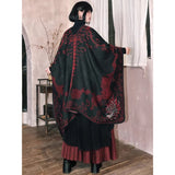 妖艶な赤と墨色が溶け合うジャガード織りのショール。静かな水面の奥に潜む緊張感をそのまま織り込んだような一枚で、縁から身頃いっぱいに広がる闘魚〈ベタ〉の姿が、優雅な尾を翻しながらも一瞬で牙を剥く気配を孕んでいます。柔らかく身体を包み込む広がりのあるシルエットは、纏う所作に合わせてゆるやかに波打ち、渦を描く文様とともに、静と動、美と闘争性がせめぎ合う世界観を静かに主張しています。