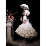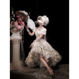 角度が変わると、まったく違う美しさを見せるクラシカルなワンピース。スクエアネックにギャザーを寄せた胸元と、ふんわりとしたパフスリーブが可憐さを演出し、ウエストから広がるたっぷりのフレアスカートは二重のフリルとレースで優美な表情を添えています。後ろ姿はすっきりとしたV字カットが施され、上品さの中に大人らしい魅力を漂わせるデザイン。まるでヴィクトリア時代の舞踏会を思わせるような、華やかで気品ある一着。