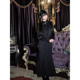 どこか物語を秘めた古典的な優雅さを漂わせるマーメイドワンピース。深い黒に包まれたこのワンピースは、首元に静かに結ばれたリボンと柔らかく重なるフリルが上半身に陰影を与えます。長い袖とすっきりと落ちる縦のラインが身体を細く引き伸ばしながら、装飾を抑えたスカートの重みとともに、静謐で気品ある佇まいに仕上がっています。