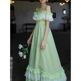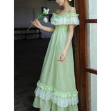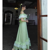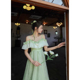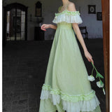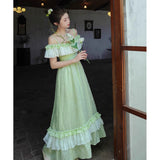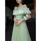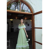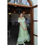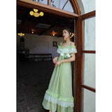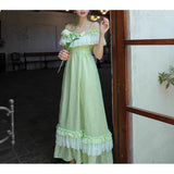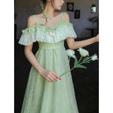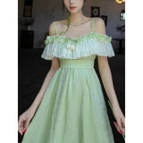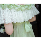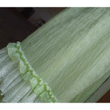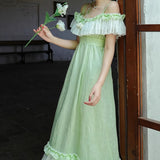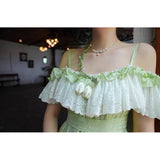 降り注ぐ陽光によって、宝石のように煌めく新緑の森。鮮やかで爽やかな色合いのキャミソールワンピース。デザインのポイントはネックラインをぐるりと囲む白いレースフリル。すべて職人の手作業によるギャザー仕上げで、美しいカーブが生まれています。控えめな模様入りジャカードは、生地表面に自然な細かなシワのような質感を生み出し、ふわりとした幻想的な雰囲気を醸し出します。
