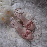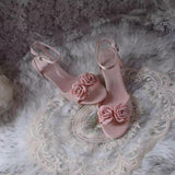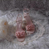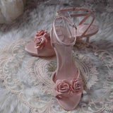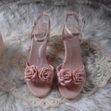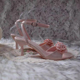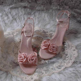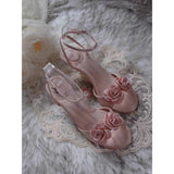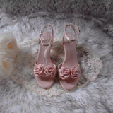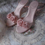 まるで咲き誇る薔薇のブーケをそのまま足元に宿したような、ロマンティックなハイヒールサンダル。淡いピンクの艶やかな素材に、二輪の立体的なローズが添えられ、繊細なアンクルストラップが、美しさを引き立てます。まるで夢の中の舞踏会に誘うかのような幻想的なアイテム。