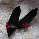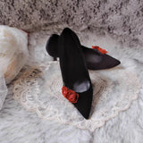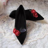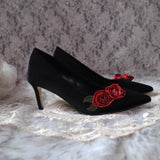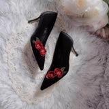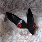 艶やかな黒のベルベット地に深紅の薔薇をあしらった、クラシカルでドラマティックなポインテッドトゥヒールパンプス。つま先に施された立体感のある赤い薔薇のモチーフは、まるで夜に咲く情熱の花のように視線を惹きつけます。ヒールはほどよい高さで、優雅さと歩きやすさを兼ね備え、美しくエレガントなシルエットを描きます。