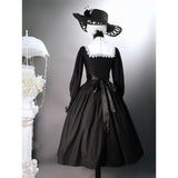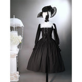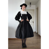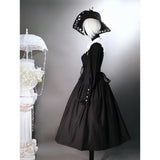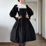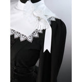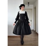優雅さと神秘を纏い、静寂の中に咲く黒薔薇のようなワンピース。白い大きなケープカラーが印象的。漆黒の生地に繊細なレースやパールボタンが浮かび上がり、控えめながらも凛とした存在感を放ちます。袖口にはギャザーとレースが施され、手元にまで物語を感じさせるディテールとなっています。バックスタイルには大きなリボンがあしらわれ、後ろ姿にも気品を宿しています。