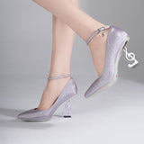 音符のト音記号をそのまま立体化したアートピースのようなヒールを組み合わせた、まるで舞台衣装の一部のようにドラマティックなパンプス。細かなラメが足元に星屑のヴェールをまとわせ、アンクルストラップには小さなト音記号チャームが揺れ、歩くたびに音楽が生まれるような幻想的な表情を醸します。クラシックなポインテッドトゥに対して、彫刻のように大胆なヒールが強烈なコントラストを作り、可憐さと存在感を同時に放っています。