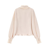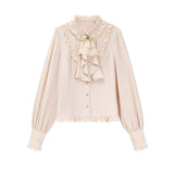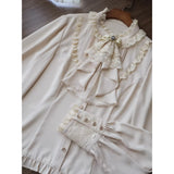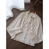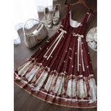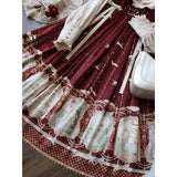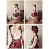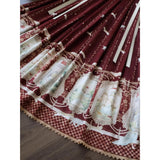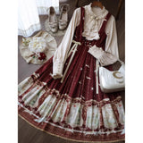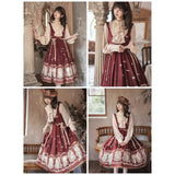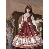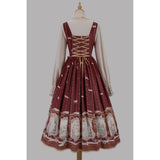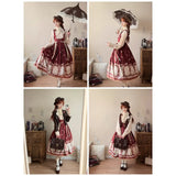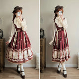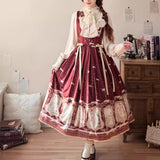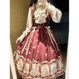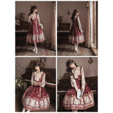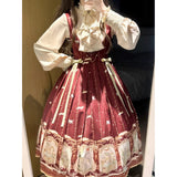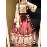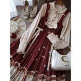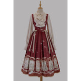物語の一頁を纏っているかのようなクラシカルなジャンパースカートとブラウス。深いボルドーを基調にしたジャンパースカートの裾には、西洋の庭園を描いた連続絵柄が配され、石畳の小径や装飾的なアーチ、草花に囲まれた風景が、まるで古い挿絵のように一周ぐるりと物語を紡いでいます。ブラウスは、首元から胸元へと重なるフリルと繊細なレースを施し、縦に流れるラインがジャンパースカートの構築的な美しさを引き立てます。