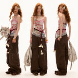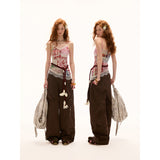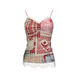 異なる柄を組み合わせたパッチワーク調のデザインが特徴的なキャミソール。レッドとピンク系を基調とした配色で、レトロでノスタルジックな雰囲気を演出しています。胸元に細かなボタンとギャザーを施し、立体感と女性らしさをプラス。裾には繊細なレーストリムがあしらわれており、甘さと品のあるディテールに。