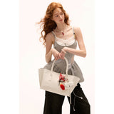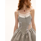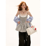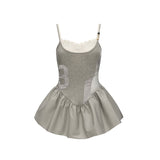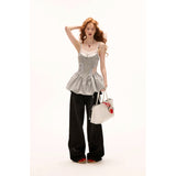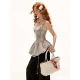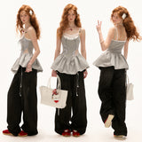 ボディ部分はリブニット素材でフィット感があり、サイドには透け感のあるレース切り替え。裾には光沢感のあるフレアなペプラムデザインが施されたへプラムキャミソールトップ。ストラップは細身で華奢な印象。ホワイトのインナーキャソールを合わせたコーデがおすすめ。スポーティとフェミニンが融合したスタイルで、カジュアルなデニムやワイドパンツとの相性抜群。