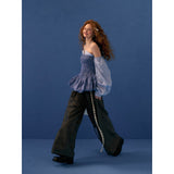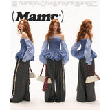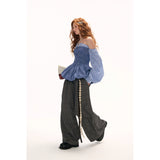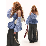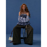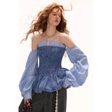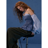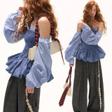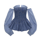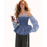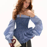 ブルーのチェック柄を基調とした、オフショルダーのロマンティックなトップス。身頃は細かなシャーリングでフィット感を出し、裾にかけてふんわりと広がるペプラムシルエットが女性らしい印象を演出。ボリュームたっぷりの長袖は肩から落ちたデザインで、クラシックとモダンが融合した華やかな一枚。
