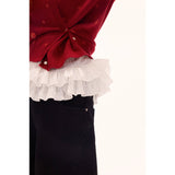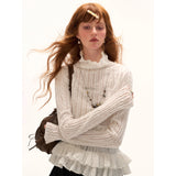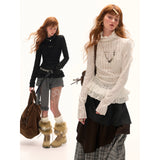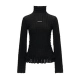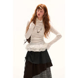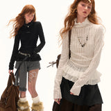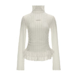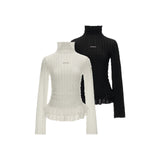 フリルをあしらったハイネックのトップス。生地は波打つような立体感のあるテクスチャーで、伸縮性があり身体に沿ったシルエットを描きます。裾部分には繊細なフリルが重なり、上品さと可憐さを兼ね備えたデザイン。ブラックはシックで大人っぽく、ホワイトは清楚で柔らかな印象を与える仕上がりになっています。