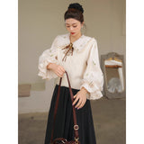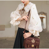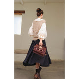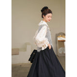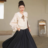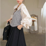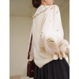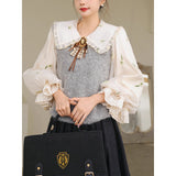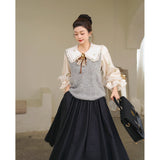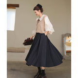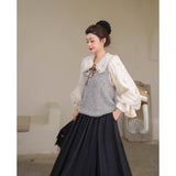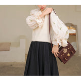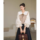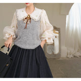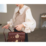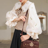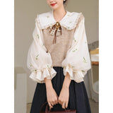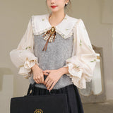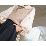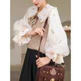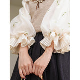風に吹かれた花束を刺繍したロマンティックなブラウスと、その柔らかさを包み込むように重ねられた、ふんわりとした生地感が特徴的なニットベスト。たっぷりとボリュームを持たせた袖口のプリーツが動くたびに優雅に揺られます。童話のワンシーンを思わせるようなノスタルジックな雰囲気に満ちたお洋服。