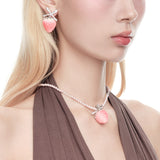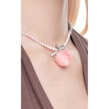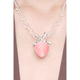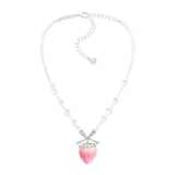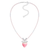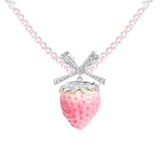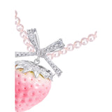 淡いピンクの苺をモチーフにしたロマンティックなネックレス。艶やかなグラデーションが美しい苺をかたどり、シルバーの葉と煌めくリボンがアクセントになっています。上品な甘さと遊び心が共存し、可憐さと華やかさを併せ持っています。まるでおとぎ話の中のお菓子の宝石みたい。