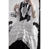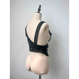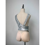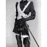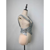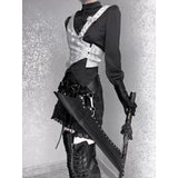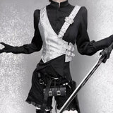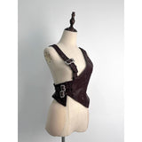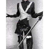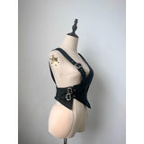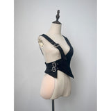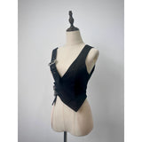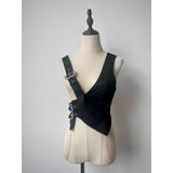 蒸気機関を動力源とした機械仕掛けのスチームパンクの世界に誘われたみたい。シャープなシルエットと鋭角のカッティングが目を惹く、アシンメトリーなショートベスト。ダブルバックルと装飾的なパーツがエッジを効かせています。ウエストラインを強調する立体的なパターン設計となっています。