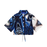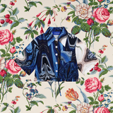 青々とした紺藍色のインクを滲ませて描いた抽象絵画のようなショート丈のシャツ。絵の具の流動性を用いて描き出したアートなアイテム。偶然が生み出した美しいインクの広がり。デニムなどカジュアルなボトムスと合わせてみて。