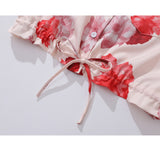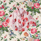 鮮やかな色彩と大胆な形から漂う、情熱的な雰囲気。美しさも儚く、繊細な美を象徴したカーネーションの花を描いたショート丈のシャツ。デニムなどカジュアルなボトムスと合わせてみて。