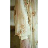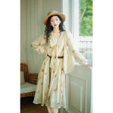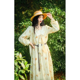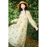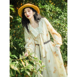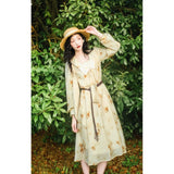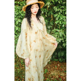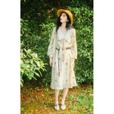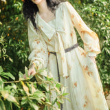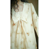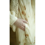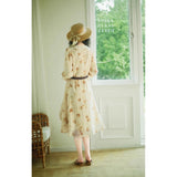淡い生成り色を基調とした花柄ワンピース。柔らかな透け感のある生地に、控えめなタッチで描かれた滲みのある花柄が散りばめられ、全体にアンティーク調の雰囲気を漂わせています。大きめのセーラーカラー風の襟にはリボンタイがあしらわれ、可憐さとクラシカルさを同時に表現しています。