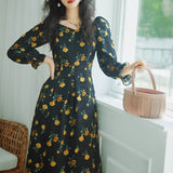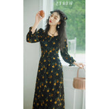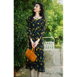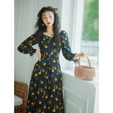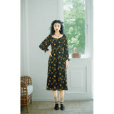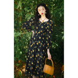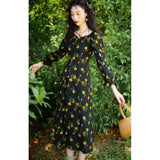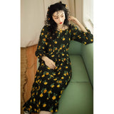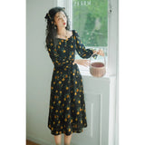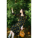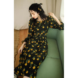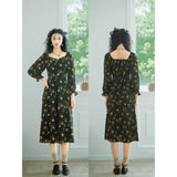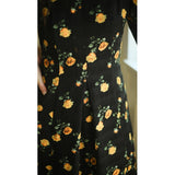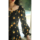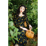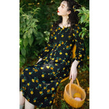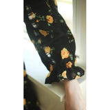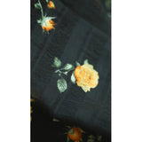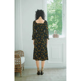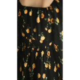 漆黒の闇夜に鮮やかな黄色い薔薇が一面に咲き誇っている様子を描いたワンピース。肩部分にふんわりとした膨らみを持たせたデザインで、ウエストラインをすっきり見せるシルエットが特徴的。女性らしい優雅さを引き立ててくれるアイテム。