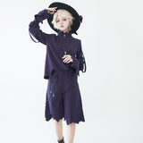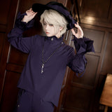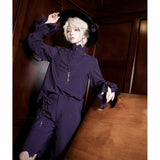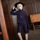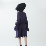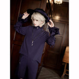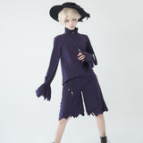 神秘的な紫の色合いに目を奪われる。格調高き中世騎士みたいなハイネックなブラウスとハーフパンツ。袖口は絞ってフレアに広げて、裾部分はギザギザと刻んだようなデザインとなっています。ボーイッシュな雰囲気に魅了される。