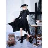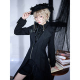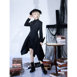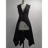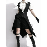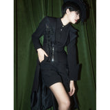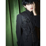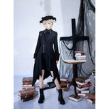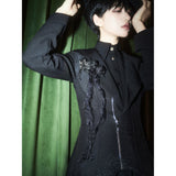 星々という宝石が散りばめられた、果てしなく続く闇の中。未知の知識と秘密が眠る漆黒の銀河のようなデザインのジップアップロングベスト。前後で丈感が異なるアシンメトリーなシルエット。中世の騎士が未来に舞い降りたようなモードなスタイル。