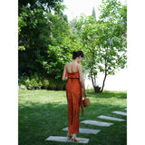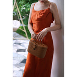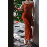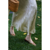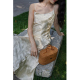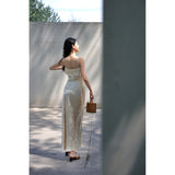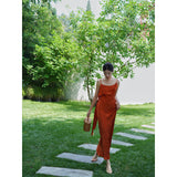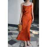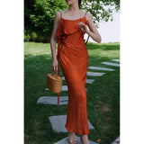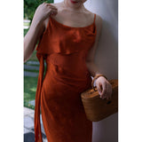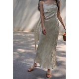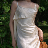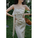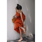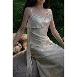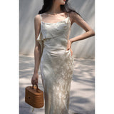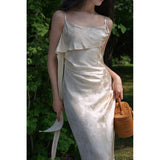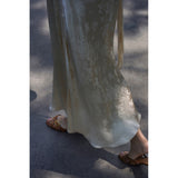 光沢感のある艶めきが洗練されたエレガントな雰囲気に演出してくれるストラップワンピース。胸まわりに生地を垂らしたドレープ感のあるシルエットで、花の蜜を求めて、優雅に舞う蝶々が描かれたアイテム。妖艶に、官能的に魅せて。