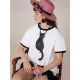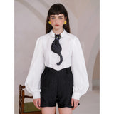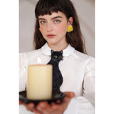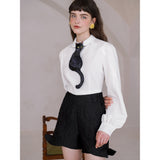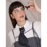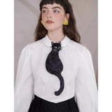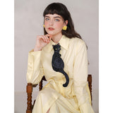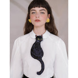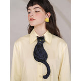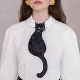 闇夜に紛れる黒猫の刺繍ネクタイ。ちょこんと大人しく座り、こちらを観察しているみたい。知的でクールな印象ながらも、甘えん坊で好奇心旺盛な黒猫。つぶらな瞳。もふもふとした艶やかな毛並み。のんびり気ままに過ごす愛くるしい姿に魅了される。
