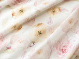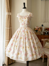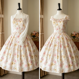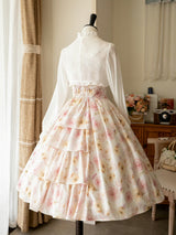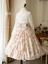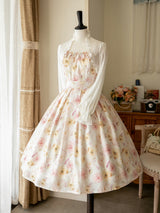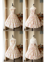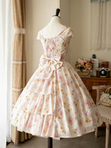上品で淑やかな花を咲かせた薔薇を描いた水彩画のワンピースとボレロカーディガン。胸元にはフリルが装飾され、バックには取り外し可能なリボンが装飾されており、段を重ねたようなデザインとなっています。ふわっと広がる裾がエレガントな雰囲気を演出してくれる。さらっとしたなめらかな生地感のアイテムです。ショート丈のボレロカーディガンにはうっすらと花柄が描かれています。