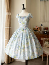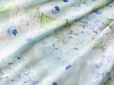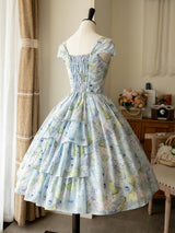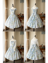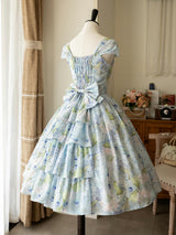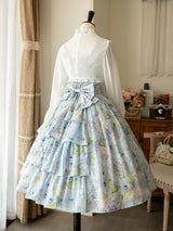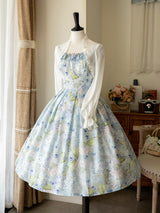 爽やかな空の下、幻想的な水色の花を咲かせた紫陽花を描いた水彩画のワンピースとボレロカーディガン。胸元にはフリルが装飾され、バックには取り外し可能なリボンが装飾されており、段を重ねたようなデザインとなっています。ふわっと広がる裾がエレガントな雰囲気を演出してくれる。さらっとしたなめらかな生地感のアイテムです。ショート丈のボレロカーディガンにはうっすらと花柄が描かれています。
