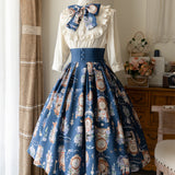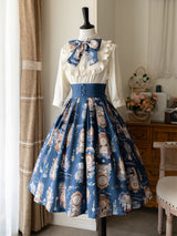 骨董屋の片隅に置かれているような西洋時計と花束が描かれたコルセットスカートとハイネックなリボンブラウス。スカートは、ウエスト部分にコルセットが装飾されています。優雅で美しい古城、絢爛に輝く宝石、空を舞う小鳥も描かれています。ブラウスは胸元にフリルをあしらった装飾が施されています。胸元のリボンは取り外しが可能となっています。ロマンティックなお嬢様を演出してみて。