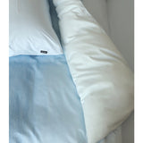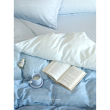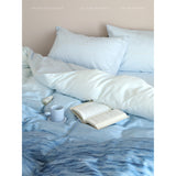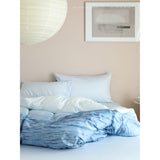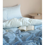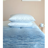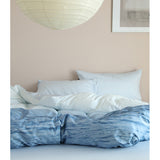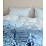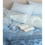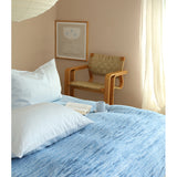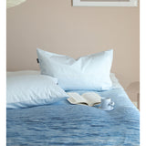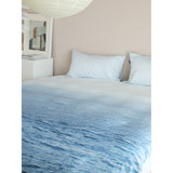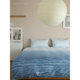 海のさざ波をそのまま包み込んだようなベッドカバー。まるで朝の静かな海をそのまま映し取ったかのような、美しいグラデーションのブルーが印象的。清潔感あふれるライトブルーから、徐々に深みを増してゆくデザインは、見る人に安らぎを与え、リラックスした眠りへと誘います。