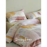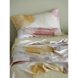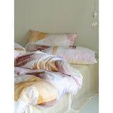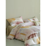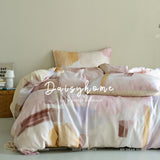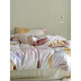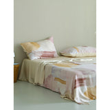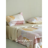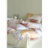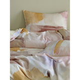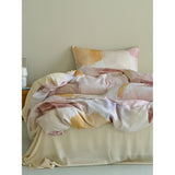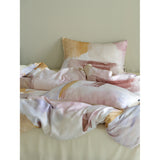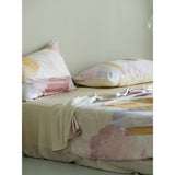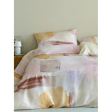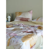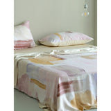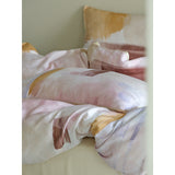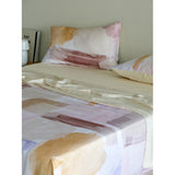 朝焼けを感じさせる幻想的な色調のベットカバー。やわらかなパステルトーンで描かれた水彩ブラシのタッチが印象的。ベージュ、ラベンダー、スモーキーピンク、マスタードイエローの筆致が重なり合い、まるで抽象画のように静かで洗練された空気をまとっています。あなたの日常を、ひとさじの幻想で包んでくれる。