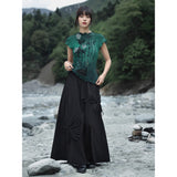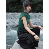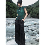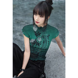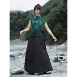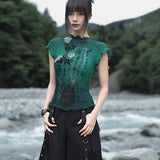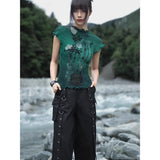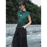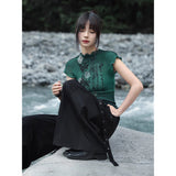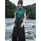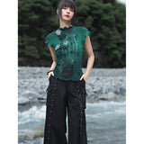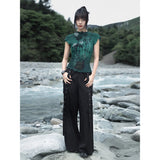花を生けた花瓶と詩句を黒墨で描いたハイネックトップス。独特の凹凸あるメッシュ調の生地が立体感を生み出します。濃淡のあるグリーンに描かれた書と花が織りなす情景は、神秘的かつレトロな美しさがあります。