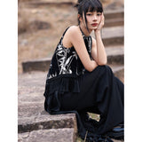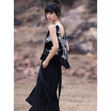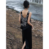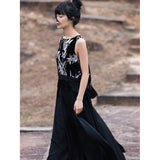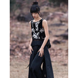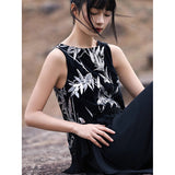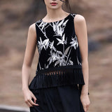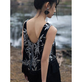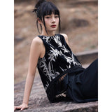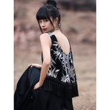 漆黒のベルベット地に、白銀の竹の刺繍が繊細に施されたノースリーブトップス。静寂の中に凛と立つ美しさを感じさせます。裾にはフリンジが揺れ、歩くたびに風をはらんでリズムを奏でるよう。背面は大胆に開いたUネック仕様で、背中のラインを美しく引き立て、洗練された艶やかさと奥ゆかしい雰囲気が共存しています。
