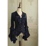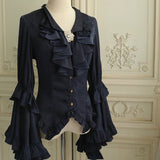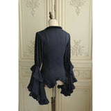 中世の貴婦人を想起させるクラシカルで幻想的な印象を放つブラウス。胸元に流れるように施されたダブルフリルが、華やかさと甘さを絶妙に両立させています。袖は複数段に重なるティアードフリルで構成され、動きに合わせて優雅に揺れます。裾はアシンメトリーに尖り、ウエストラインを引き締めつつ、エレガントなフレアを描きます。重厚感と上品さを演出してくれるアイテム。