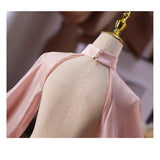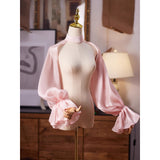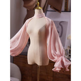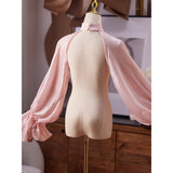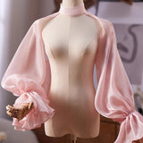 ヴィクトリアン調の優雅さを放つボレロトップス。ハイネックのデザインが上品さを引き立て、肩から袖にかけて流れるように広がるシアーオーガンジー素材のパフスリーブが、空気を含んだような立体感を演出しています。袖口はたっぷりとギャザーを寄せており、華やかでエレガントな印象に。バックスタイルもすっきりと美しく、どの角度から見ても洗練されたシルエットが際立ちます。