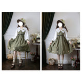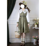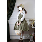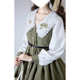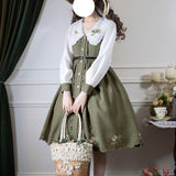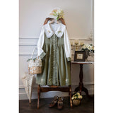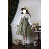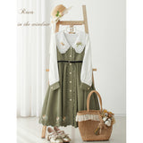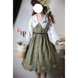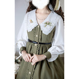 咲き誇る薔薇の花を裾部分に刺繍したドッキングワンピース。ジャンパースカートとブラウスを組み合わせたアイテム。フロントには縦のラインにフリルが装飾されており、段を重ねた存在感のある襟が印象的。繊細で可愛らしい雰囲気が漂います。