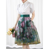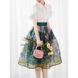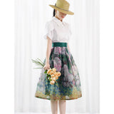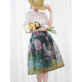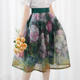 咲き誇る薔薇の花を油彩で描いたフレアスカート。透明感のあるオーガンジー素材に、華やかな花々が重層的に描かれており、西洋画家を想起させる筆致の草花が広がります。織りなす色彩はまるで油絵のよう。美しい濃淡に魅了される。