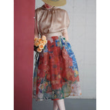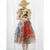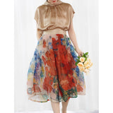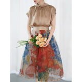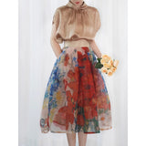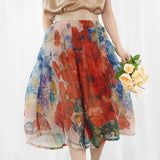 真っ赤な花をつけたヒゲナシの花を油彩で描いたフレアスカート。透明感のあるオーガンジー素材に、赤・青・黄を基調とした色鮮やかな抽象花柄が大胆に描かれています。まるで印象派の絵画をそのまま纏ったかのような華やかなアイテム。