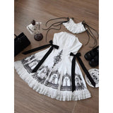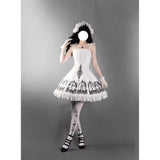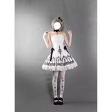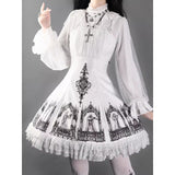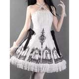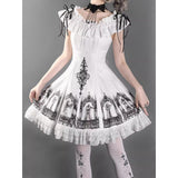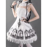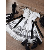 骸が奏でる、永遠に終わらぬ独奏。忘れられた亡者たちの想いが、旋律となって響き渡る。荘厳なゴシック建築を彷彿とさせる美術的モチーフ大胆に描かれたストラップワンピース。スカート部分にはアーチ状の柱や尖塔の中に楽器を奏でる骸骨の姿が繰り返し配されており、まるで聖堂の壁画のような荘厳な雰囲気を醸し出します。