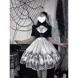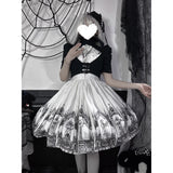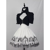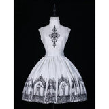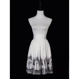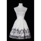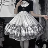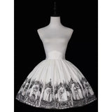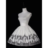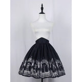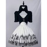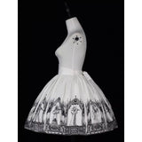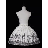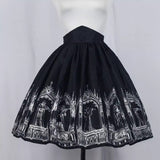 骸が奏でる、永遠に終わらぬ独奏。忘れられた亡者たちの想いが、旋律となって響き渡る。荘厳なゴシック建築を彷彿とさせる美術的モチーフ大胆に描かれたハイウエストなスカート。アーチ状の柱や尖塔の中に楽器を奏でる骸骨の姿が繰り返し配されており、まるで荘厳な聖堂の壁画のような荘厳な雰囲気を醸し出します。