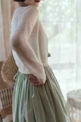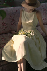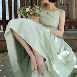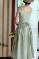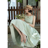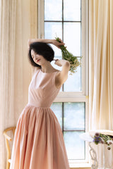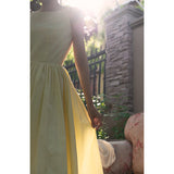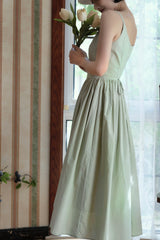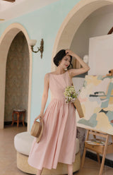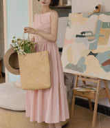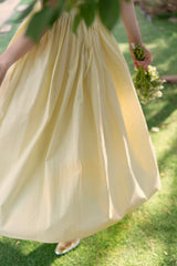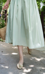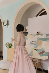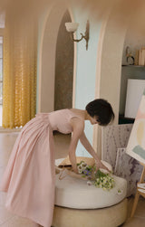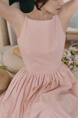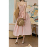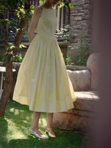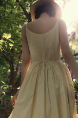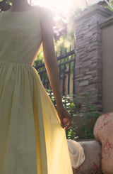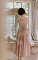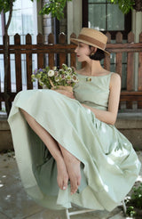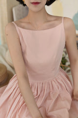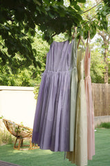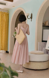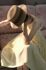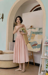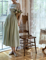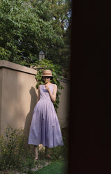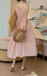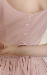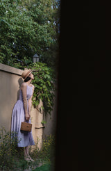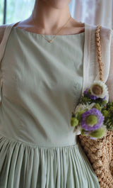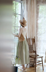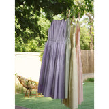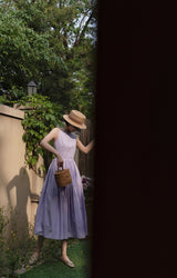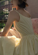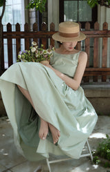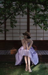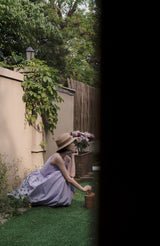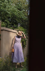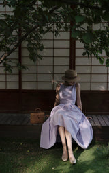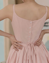 ヴァカンス気分を満喫したくなるストラップワンピース。たっぷりの生地量で仕立てられており、スカート部分の膨らみのあるボリュームが特徴的。背中側に艶めきのある貝ボタンが装飾されており、バックでリボンを結べるようになっています。優雅で爽やかな雰囲気たっぷり。