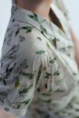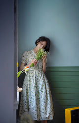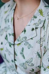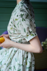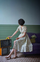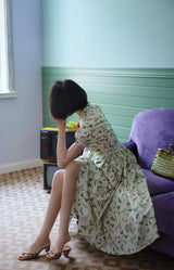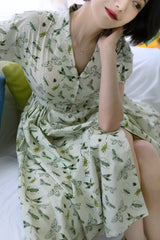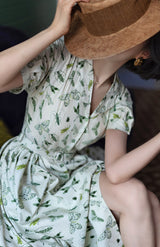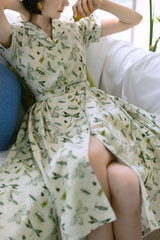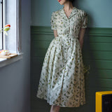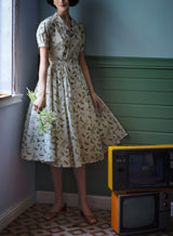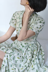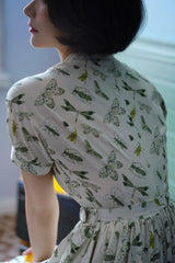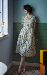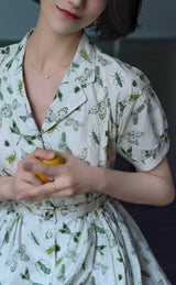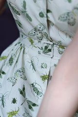 蝶々や蜻蛉など緑色の昆虫をばかりを集めて描いたレトロなワンピース。昆虫画家によって描かれた筆致な挿絵。色彩豊かなイラストは目を楽しませてくれる。ウエストにはベルトが装飾されています。美しさを際立たせてくれる50年代ルック。