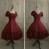 角度が変わると、まったく違う美しさを見せるクラシカルなワンピース。スクエアネックにギャザーを寄せた胸元と、ふんわりとしたパフスリーブが可憐さを演出し、ウエストから広がるたっぷりのフレアスカートは二重のフリルとレースで優美な表情を添えています。後ろ姿はすっきりとしたV字カットが施され、上品さの中に大人らしい魅力を漂わせるデザイン。まるでヴィクトリア時代の舞踏会を思わせるような、華やかで気品ある一着。