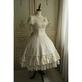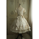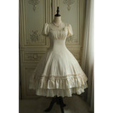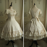 角度が変わると、まったく違う美しさを見せるクラシカルなワンピース。スクエアネックにギャザーを寄せた胸元と、ふんわりとしたパフスリーブが可憐さを演出し、ウエストから広がるたっぷりのフレアスカートは二重のフリルとレースで優美な表情を添えています。後ろ姿はすっきりとしたV字カットが施され、上品さの中に大人らしい魅力を漂わせるデザイン。まるでヴィクトリア時代の舞踏会を思わせるような、華やかで気品ある一着。